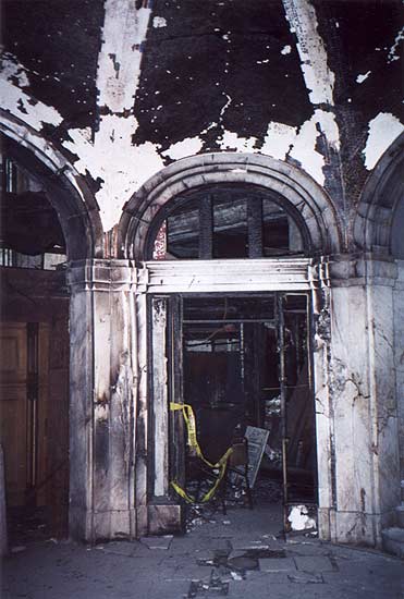 A corner of the lobby exhibiting fire damage.