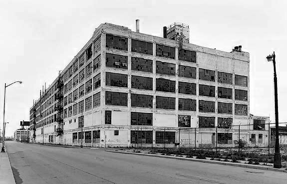 Fisher Body's massive bulk is typical of the reinforced concrete factory type developed by Albert Kahn at the Packard plant.
