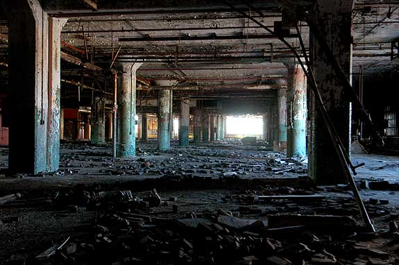 The first and second floors are dark, many of the sash windows have been covered.