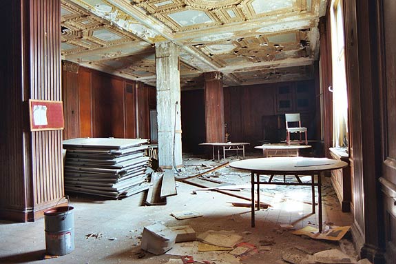 Piles of tables and paperwork cannot hide the beauty of the dining room.
