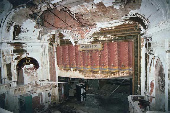 Closer look at the proscenium. The word "Asbestos" was placed on the curtain to reassure patrons of the theater's safety in a fire. The curtain would prevent any fire from the stage spreading to the seats.